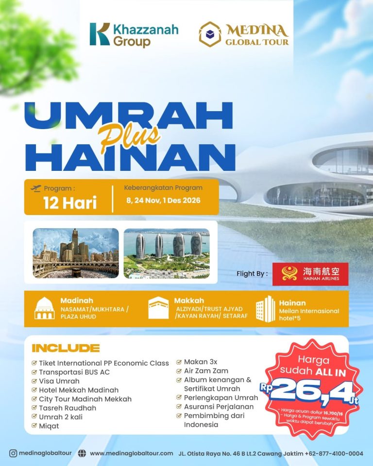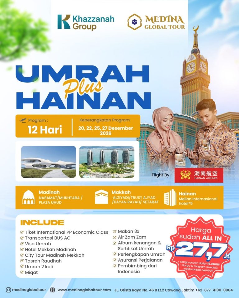 Khazzanah Group bersama Medina Global Tour menghadirkan berbagai paket Umrah dengan harga terjangkau, fasilitas lengkap, dan bimbingan ibadah yang jelas. Semua paket harga All-In, sehingga jamaah dapat berangkat dengan tenang tanpa khawatir biaya tambahan di perjalanan.