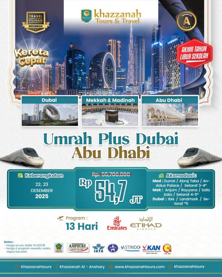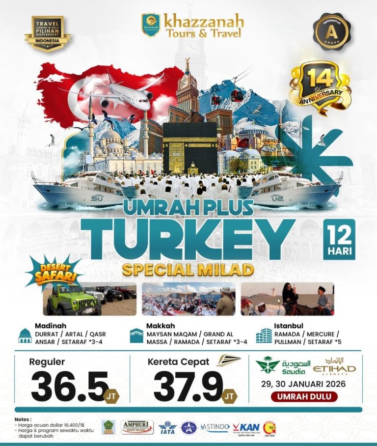 Khazzanah Tours mempersembahkan Paket Umrah Plus untuk jamaah yang menginginkan pengalaman ibadah yang sempurna sekaligus eksplorasi wisata dunia. Seusai melaksanakan ibadah Umrah, Anda akan diajak menikmati pesona arsitektur, sejarah, dan budaya Islam di destinasi istimewa seperti Turki, Dubai, atau Eropa. Perjalanan penuh nilai, kenyamanan, dan kesan mendalam yang dirancang dengan pelayanan terbaik.