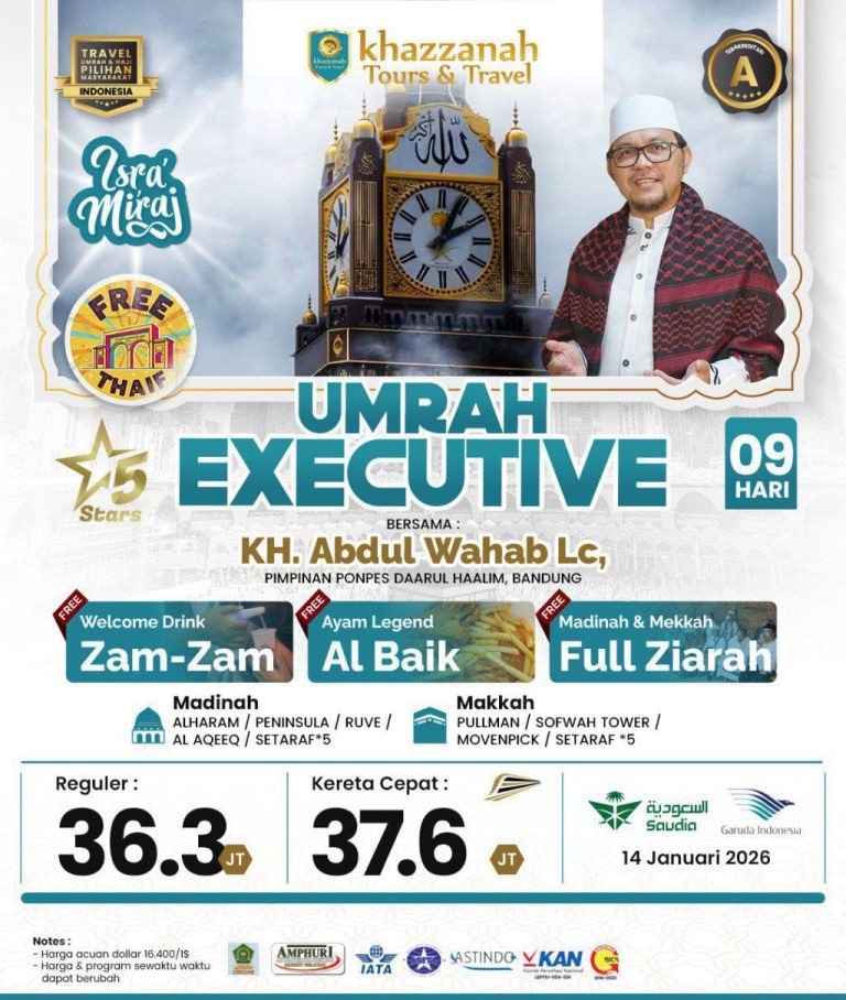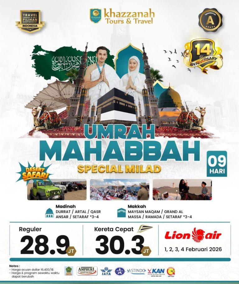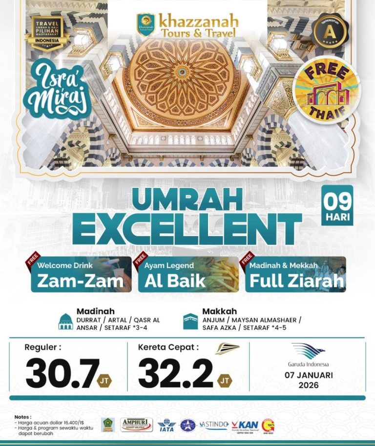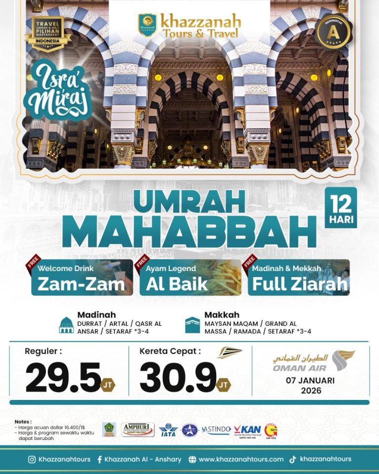 Khazzanah Tours menghadirkan Paket Umrah Reguler yang dirancang untuk jamaah yang mengutamakan kenyamanan dalam ibadah tanpa harus mengeluarkan biaya besar. Menginap di hotel yang dekat dengan Masjidil Haram dan Masjid Nabawi, layanan makan yang lezat, serta pendampingan ibadah dari ustadz pembimbing akan memastikan perjalanan rohani Anda berlangsung lancar dan menenteramkan. Mari wujudkan panggilan hati menuju Tanah Suci bersama kami.